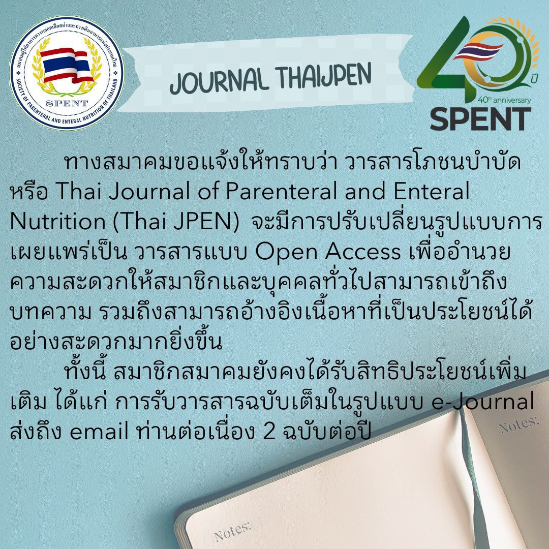 เรียนแจ้งปรับเปลี่ยนรูปแบบการเผยแพร่วารสาร Thai Journal of Parenteral and Enteral Nutrition (Thai JPEN) เป็นแบบ Open Access