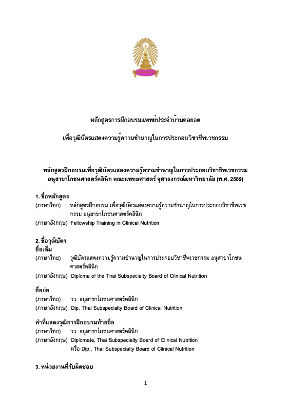 หลักสูตรฝ ึ กอบรมเพื2อวุฒิบัตรแสดงความรู้ความชํานาญในการประกอบวิชาชีพเวชกรรม อนุสาขาโภชนศาสตร์คลิน ิก คณะแพทยศาสตร์ จุฬาลงกรณ์มหาวิทยาลัย (พ.ศ. 2569)