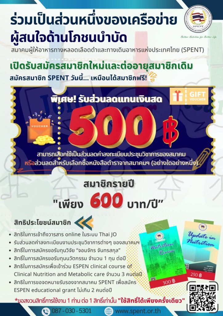ร่วมเป็นส่วนหนึ่งของเครือข่ายผู้สนใจด้านโภชนบำบัดกับสมาคมผู้ให้อาหารทางหลอดเลือดดำและทางเดินอาหารแห่งประเทศไทย (SPENT) พร้อมรับสิทธิพิเศษทันที!